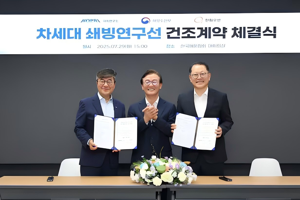 The Korean shipbuilder Hanwha Ocean announced on July 29 that it has signed a contract with the Ministry of Oceans and Fisheries to build a next-generation icebreaker research vessel for polar research. The vessel, set to be completed by December 2029, will have a gross tonnage of 16,560 tons, more than double that of Korea's current icebreaker, Araon. It will feature eco-friendly dual-fuel electric propulsion using LNG and will be capable of breaking through 1.5-meter-thick ice in temperatures as low as -45°C. The vessel will also provide high-end comfort for researchers.