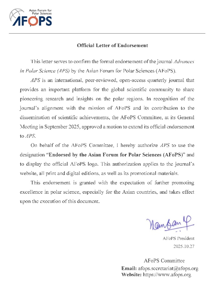 PRIC is honored to announce that Advances in Polar Science (APS) has been officially endorsed by the Asian Forum for Polar Sciences (AFoPS). The endorsement was formally approved by the AFoPS Committee during its annual meeting in Goa, India, August 2025.