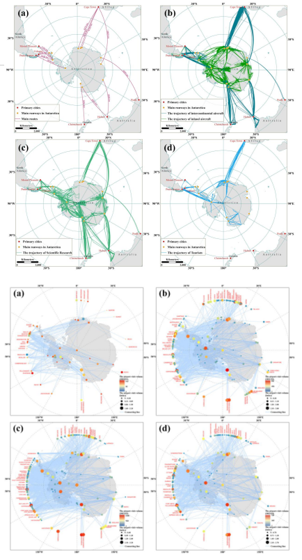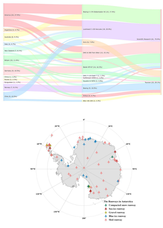 Recently, the research team led by Professor Songtao Ai at the Chinese Antarctic Surveying and Mapping Research Center of Wuhan University published a paper in the International Journal of Digital Earth, entitled “Worldwide aviation connections with Antarctica: examining global linkages and their roles in scientific expeditions.” This study investigates the global connectivity of Antarctic aviation by integrating data on 86 aircraft operating in the region between 2020 and 2024, 80 runways distributed across the Antarctic continent, and 4,194 airports from 216 countries worldwide. The research mapped the flight trajectories of Antarctic aircraft, consolidated both intercontinental routes to Antarctica and inland routes within the continent, and further analyzed the structure of the Antarctic aviation network, the runway infrastructure, and its connections with other continents. In addition, the study quantified the frequency and patterns of global airport visits by Antarctic aircraft. It also explored the impact of the COVID-19 pandemic on Antarctic aviation connectivity, highlighting the role of air transport in facilitating the potential spread of viruses.